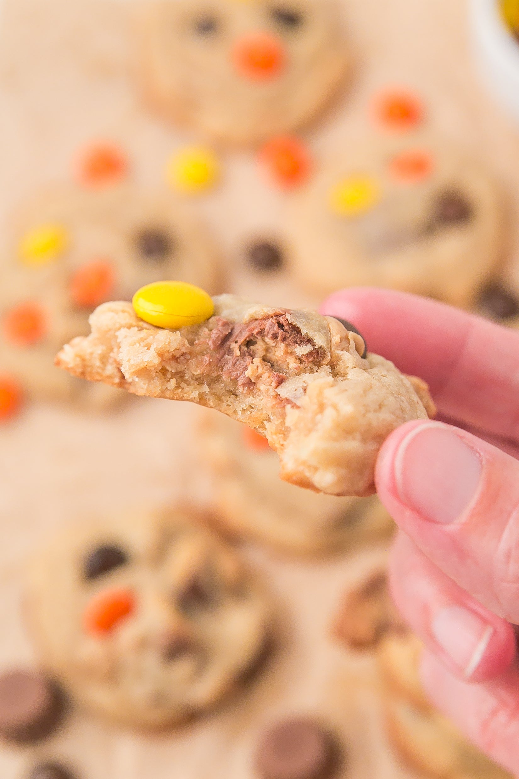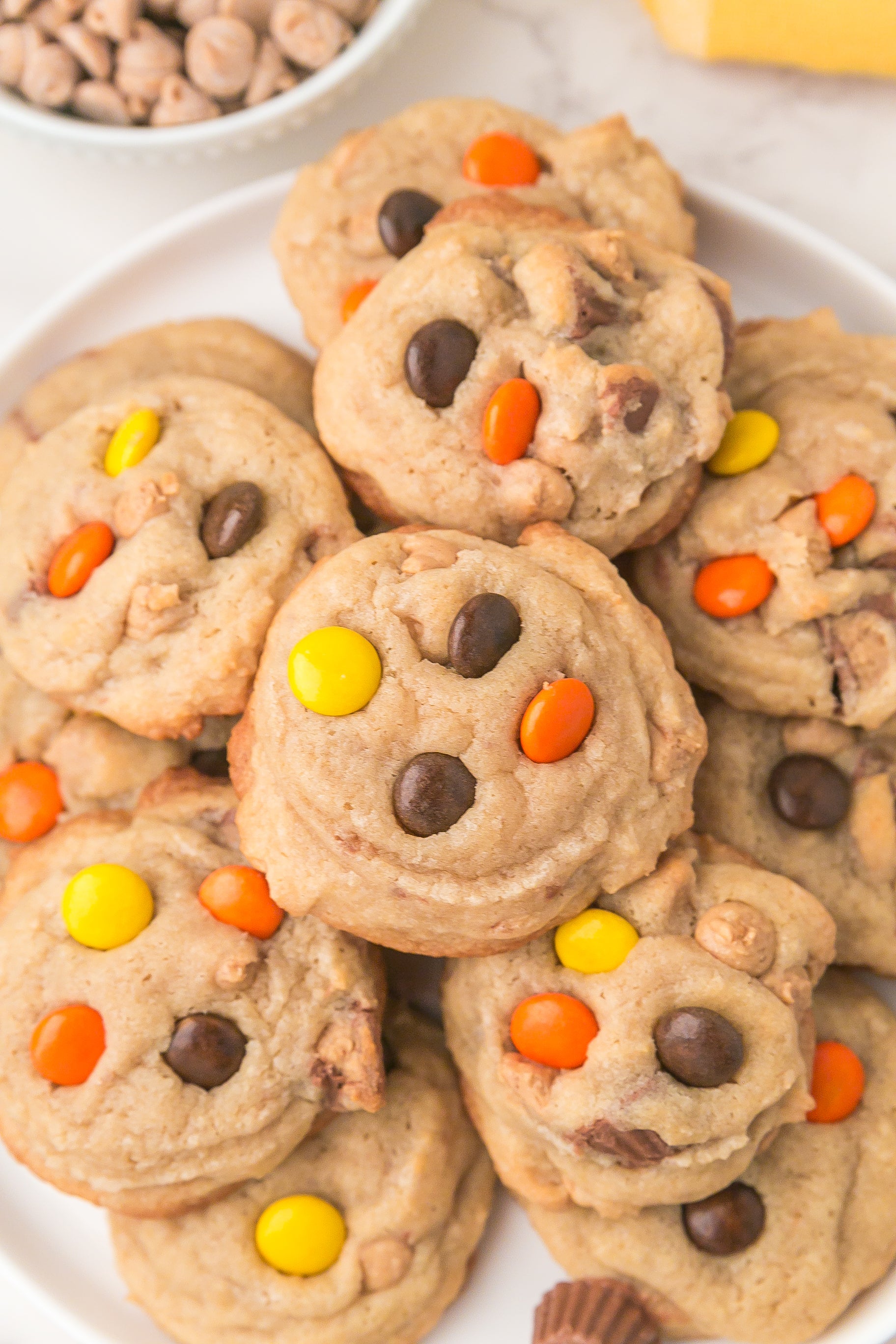 Made with flour, baking powder, baking soda, sea salt, butter, brown sugar, granulated sugar, egg, vanilla extract, Reese's peanut butter chips, mini Reese's cups and Reese's pieces.
