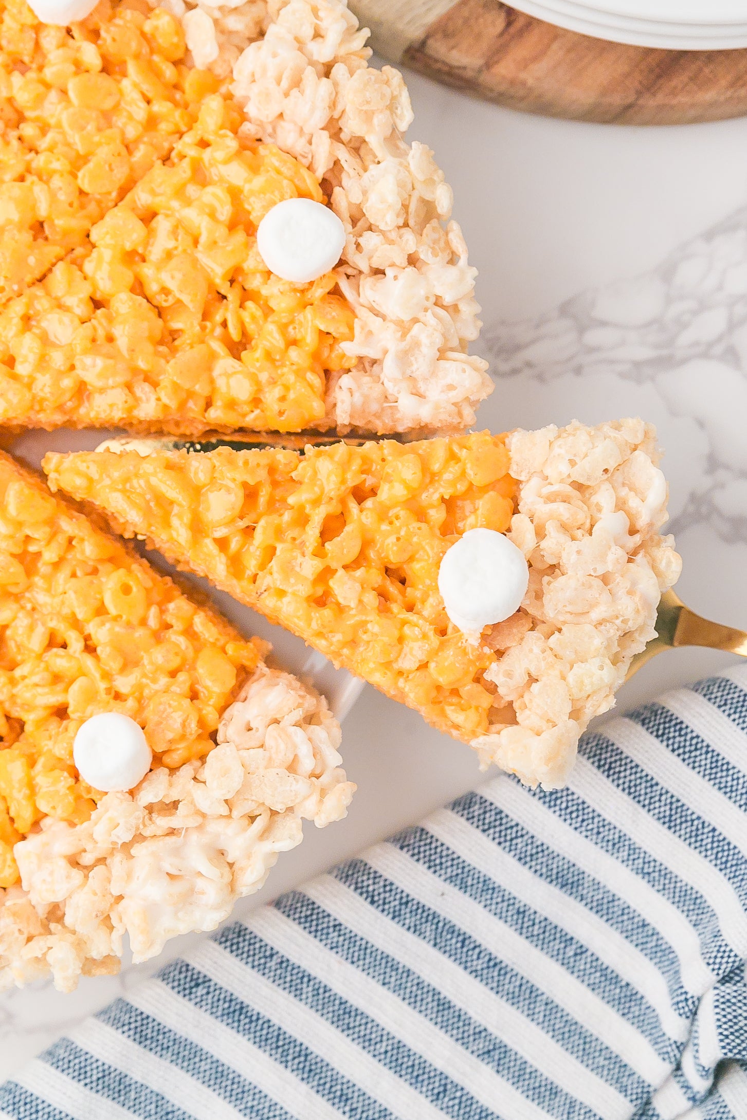 Made with Rice Krispies, butter, marshmallows and orange food coloring.